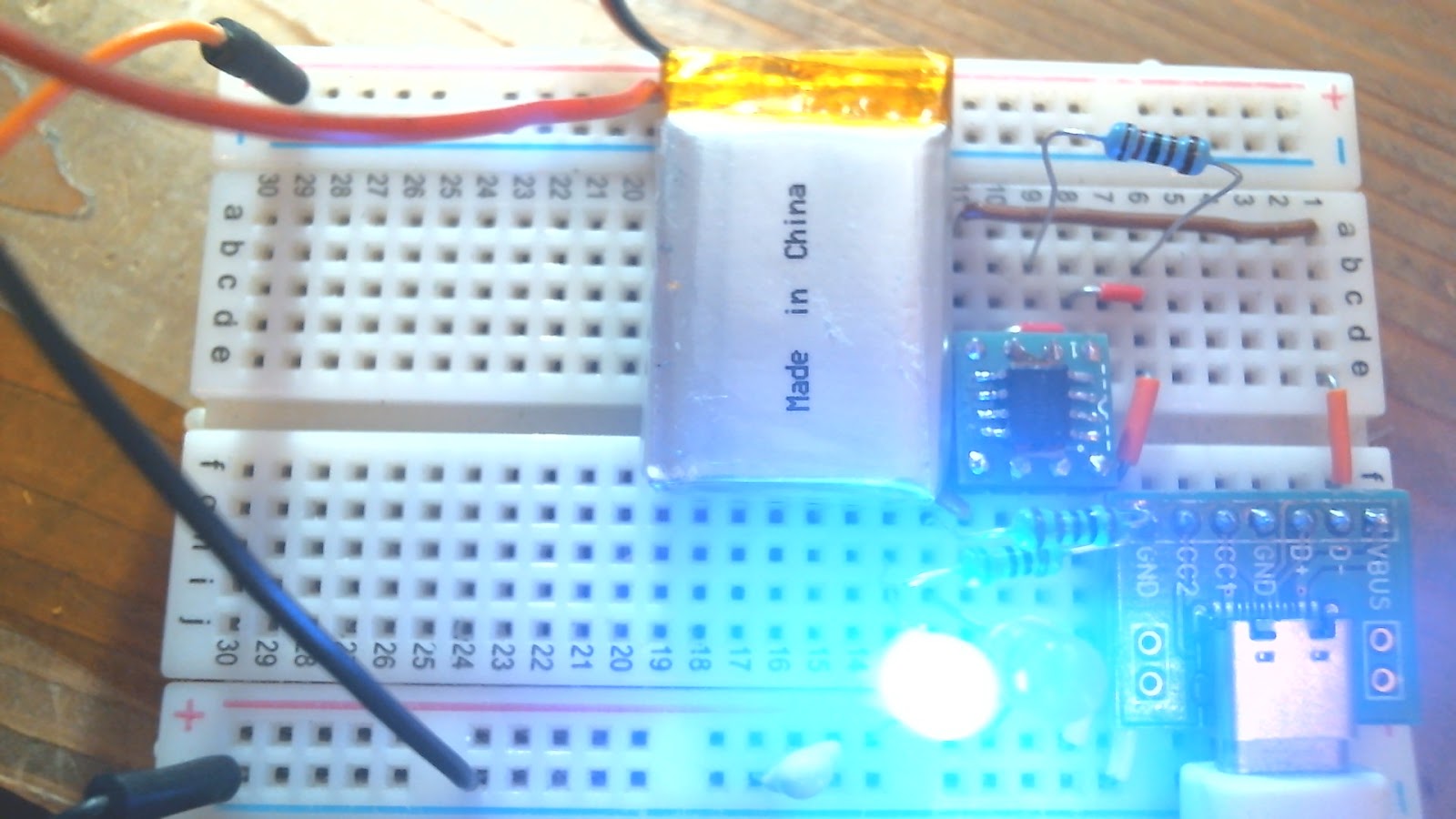 電源はUSB(携帯の古い充電器2A)から取得。テストなので、USB-Cの5.1kの抵抗はつけてはいないが、回路はいたってシンプル。1.2kの抵抗で充電電流を決めて、それ以外は充電状態を示すLEDのみ。